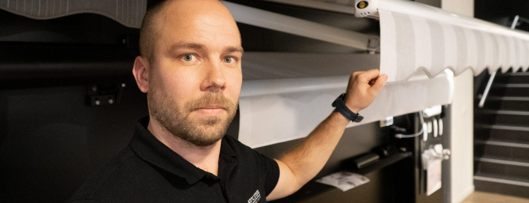Jukka on ollut vastuussa Tampereen myymälästä vasta pari vuotta, mutta on omien sanojensa mukaan päässyt hyvin kiinni aurinkosuojauksen erikoisliikkeen pyörittämisen arkeen.